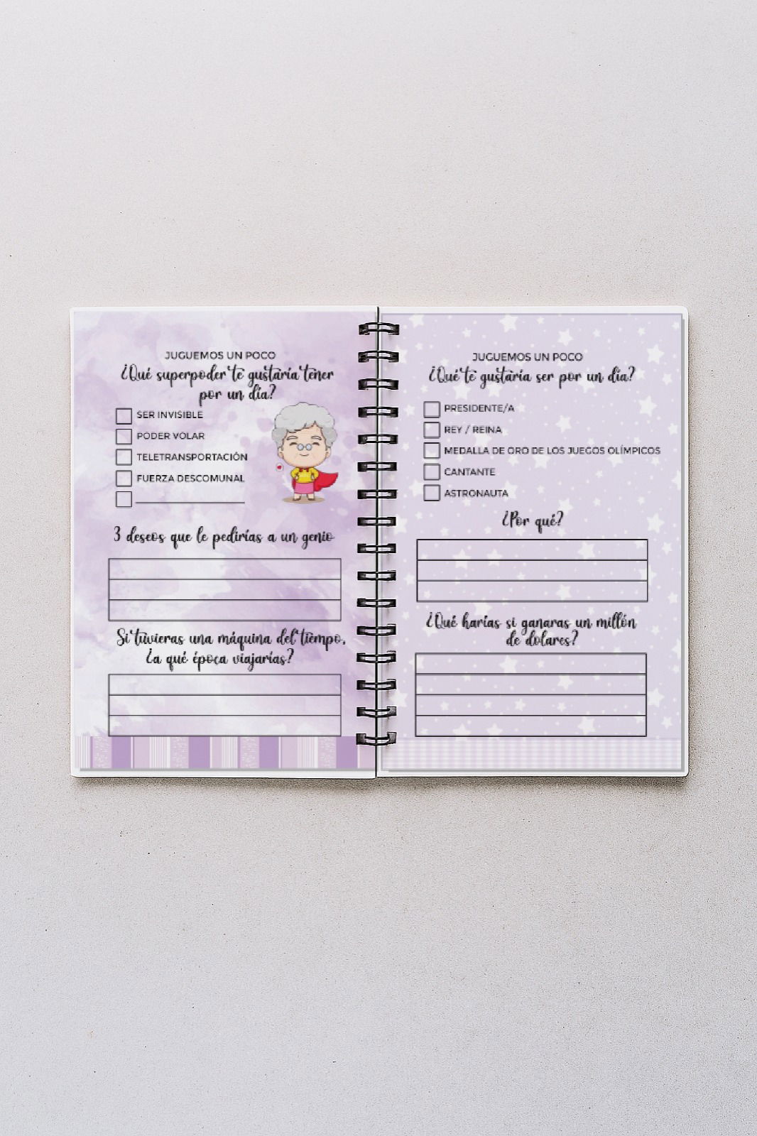Abuela cuéntame tu historia es un diario lleno de preguntas, juegos y espacio para fotos. Con este diario vas a conocer TODO sobre tu abuela, las mejores anécdotas guardadas por siempre.😍